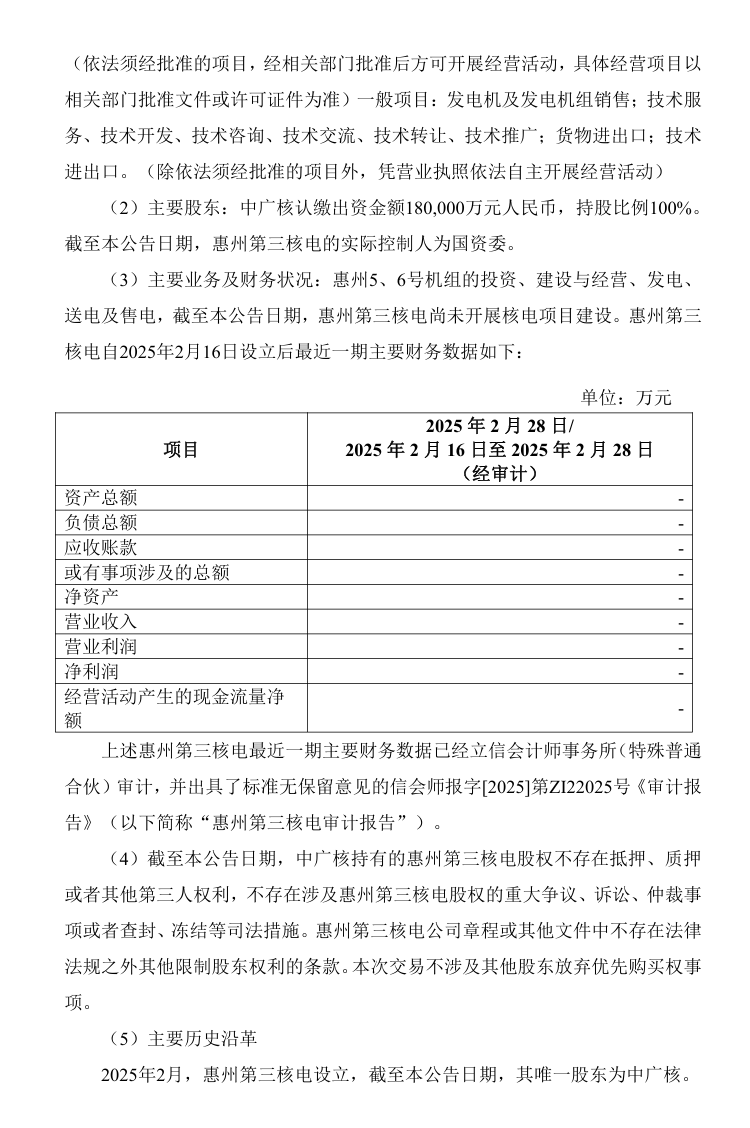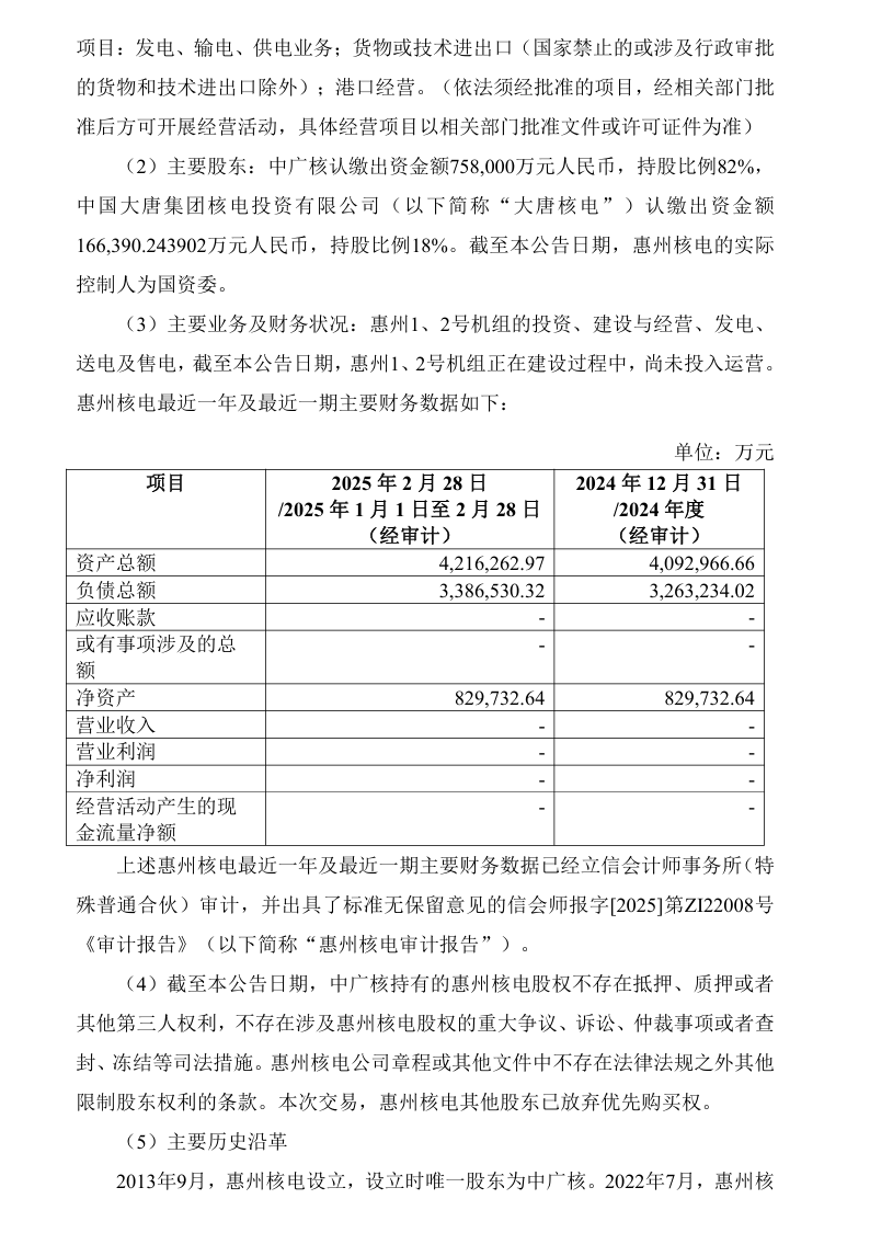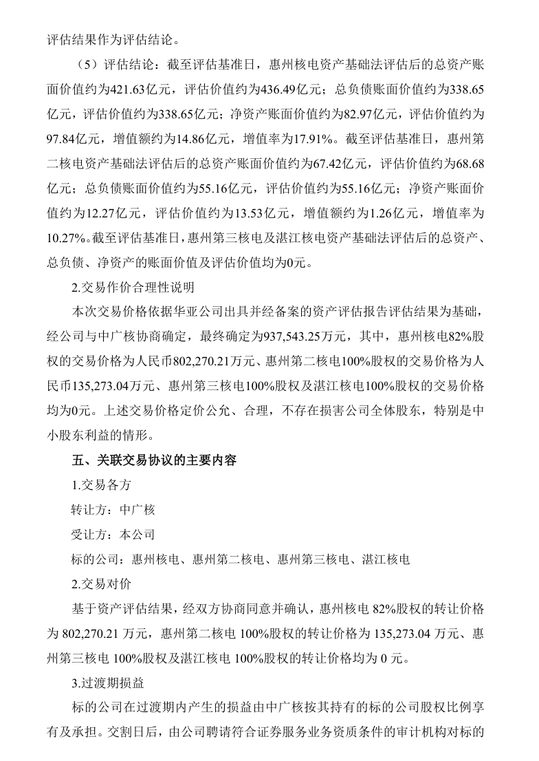 基于资产评估结果,经双方协商同意并确认,惠州核电82%股权的转让价格为802270.21万元,惠州第二核电100%股权的转让价格为135273.04万元、惠州第三核电100%股权及湛江核电100%股权的转让价格均为0元。