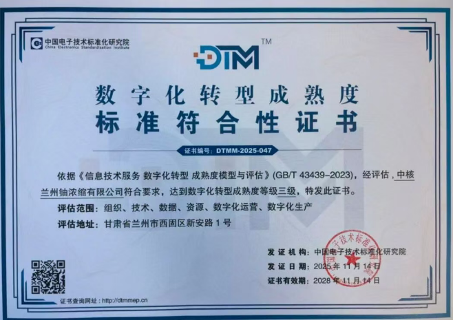 作为中国铀浓缩产业的摇篮,中核兰铀近年来锚定数智化铀浓缩工厂建设目标,以工业互联网、5G等技术为抓手,推动核燃料生产全流程的数字化升级:在生产端,搭建了覆盖生产、质量、设备的智能运维一体化平台,实现关键工艺数据的实时采集与分析;在管理端,构建了以ERP、能源管理系统为核心的一体化管控体系,达成业务流程的无纸化、透明化运转。此次三级认证的获得,是对其数字化转型阶段性成果的权威背书。