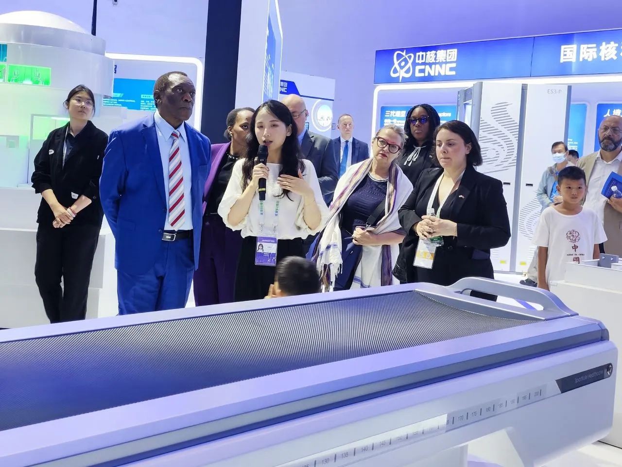 鲲硼刀BNCT肿瘤治疗系统、智能定量SPECT/CT、MR系列货物/车辆检查系统、ES3-P毫米波人体安全检查仪核技术应用展区的大量模型,如同一个个生动的故事,讲述了核技术在医疗、环保等方面的广泛应用,展现了集团公司在面向人民生命健康等关键领域的有力担当和创新实践。