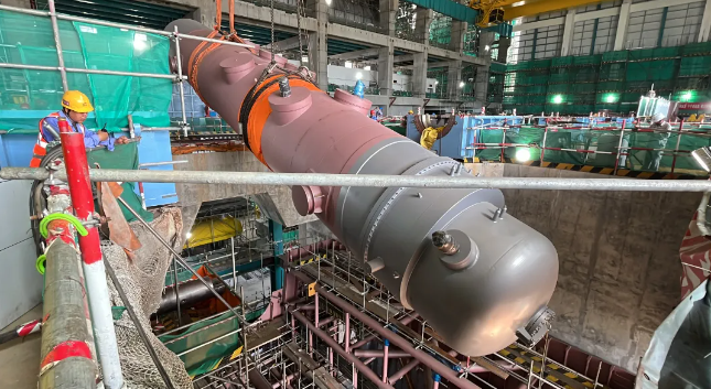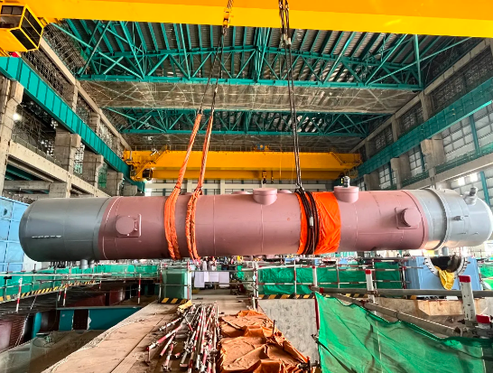 这个大家伙学名叫复式低压加热器,别名“热得快”!它的其重量约为170t,长度约23m。它是利用汽轮机抽汽来加热凝汽器凝结水的主要设备之一,是汽轮机回热系统的重要组成部分,能有效地提高凝结水温度和回收热量,对提高核电的经济效益具有重要意义。