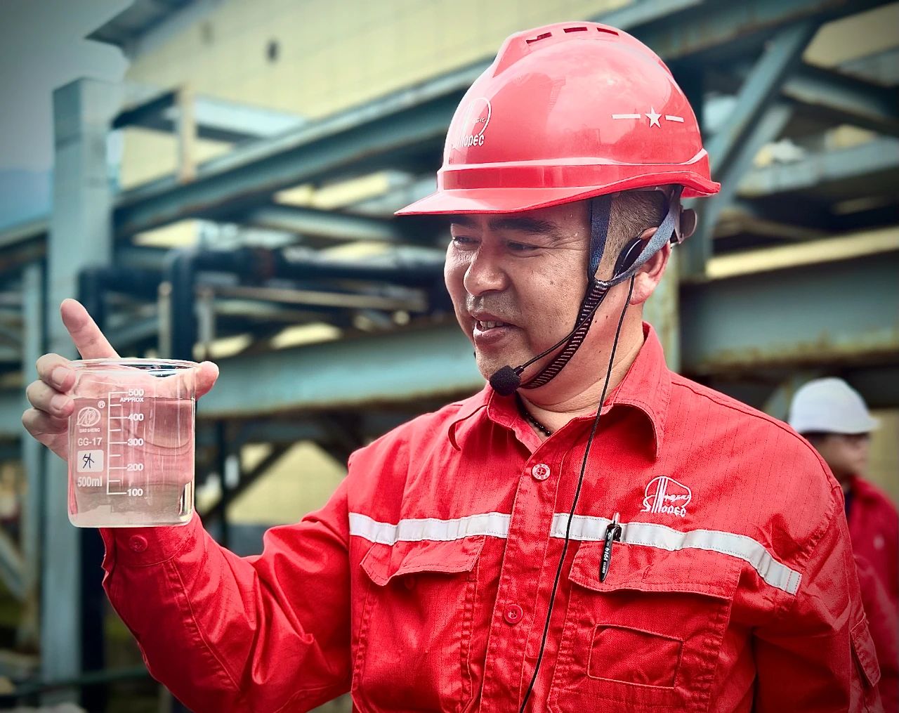 ▲工作人员展示处理合格的产出水