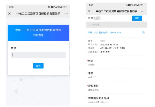 标准化程序应用好助手。项目部在柴油机大门扩建项目试点标准化工作场地,通过软件严谨编排工期计划。面对下半年即将到来的208和602大修,提前策划良好实践。为防止员工工作授权到期、人员超范围作业,项目部开发自查系统,通过微信识别扫描二维码,输入对应信息,即可随时了解自己的授权信息,如动火监护人授权及有效期、兼职安全员授权及有效期、有限空间监护人授权及有效期等,使用快捷、方便、简易、高效。