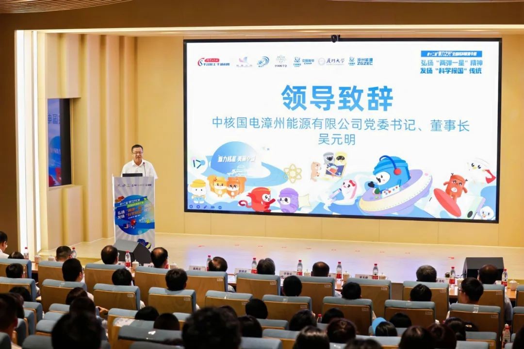 漳州能源党委书记、董事长吴元明代表承办方致辞。他表示今年是新中国成立75周年,也是我国第一颗原子弹成功爆炸60周年,即将迎来我国核工业创建70周年,第十二届魅力之光在这个特殊的年份举办,具有更加深远的意义。回望过去,魅力之光在十一年间,不仅传播了科学知识,弘扬了科学精神,更让数百万公众走进核电、了解核电、拥抱核电。漳州能源有幸接过魅力之光的接力棒,将继续秉承魅力之光的宗旨,致力于提升公众的核科学素养,营造核产业发展的良好氛围。