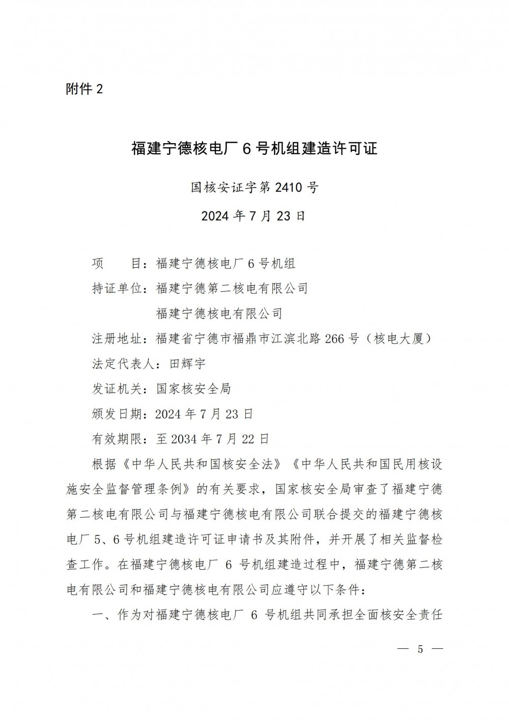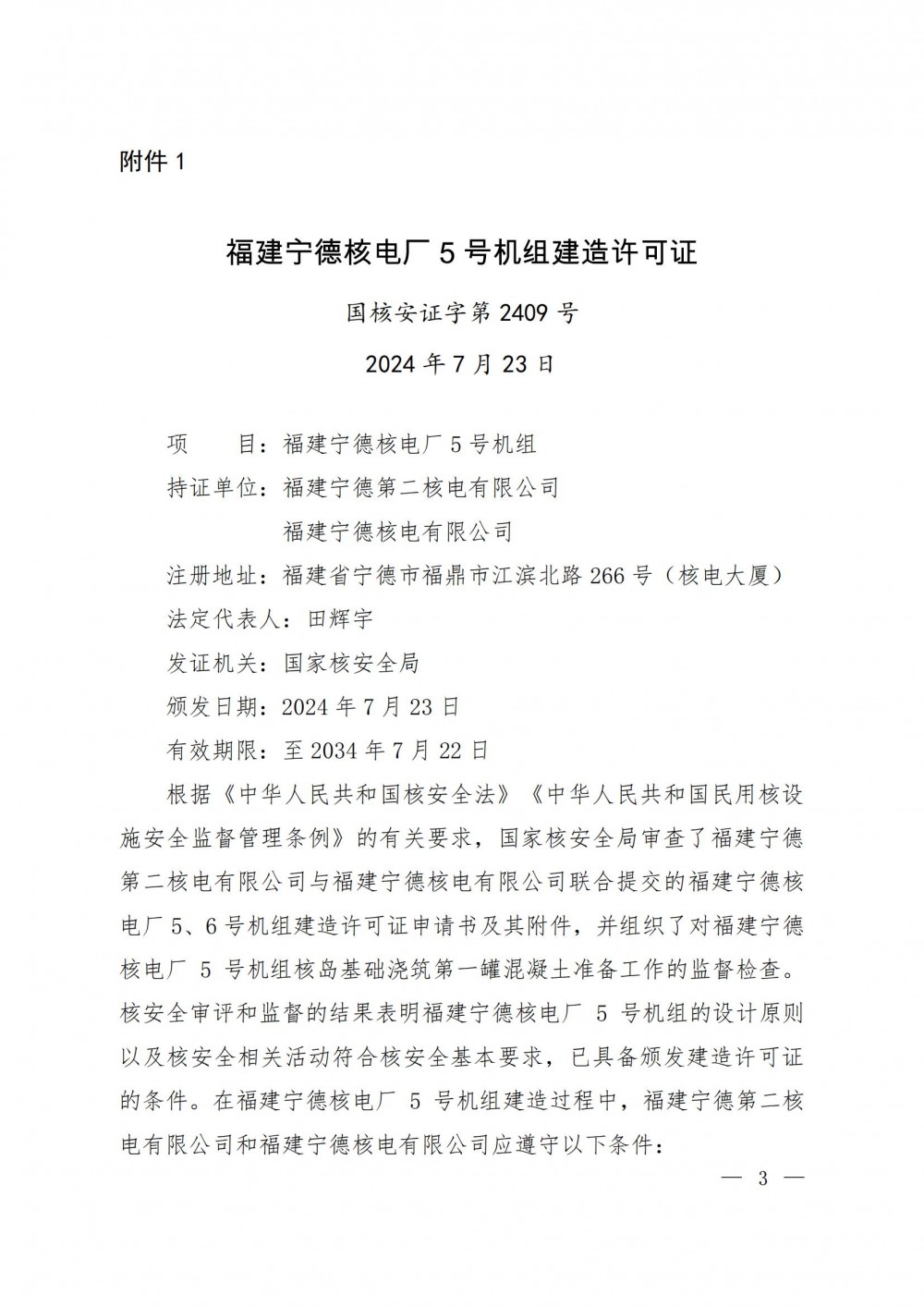 1.福建宁德核电厂5号机组建造许可证