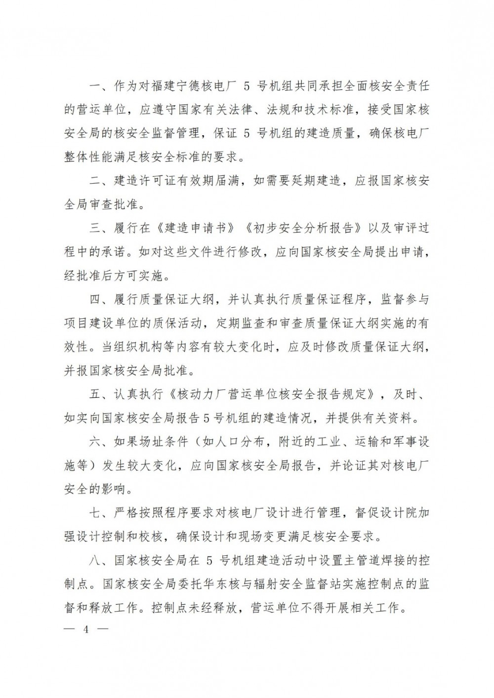 你公司应按照《福建宁德核电厂5号机组建造许可证》和《福建宁德核电厂6号机组建造许可证》规定的条件,加强质量管理,确保建造工程质量。