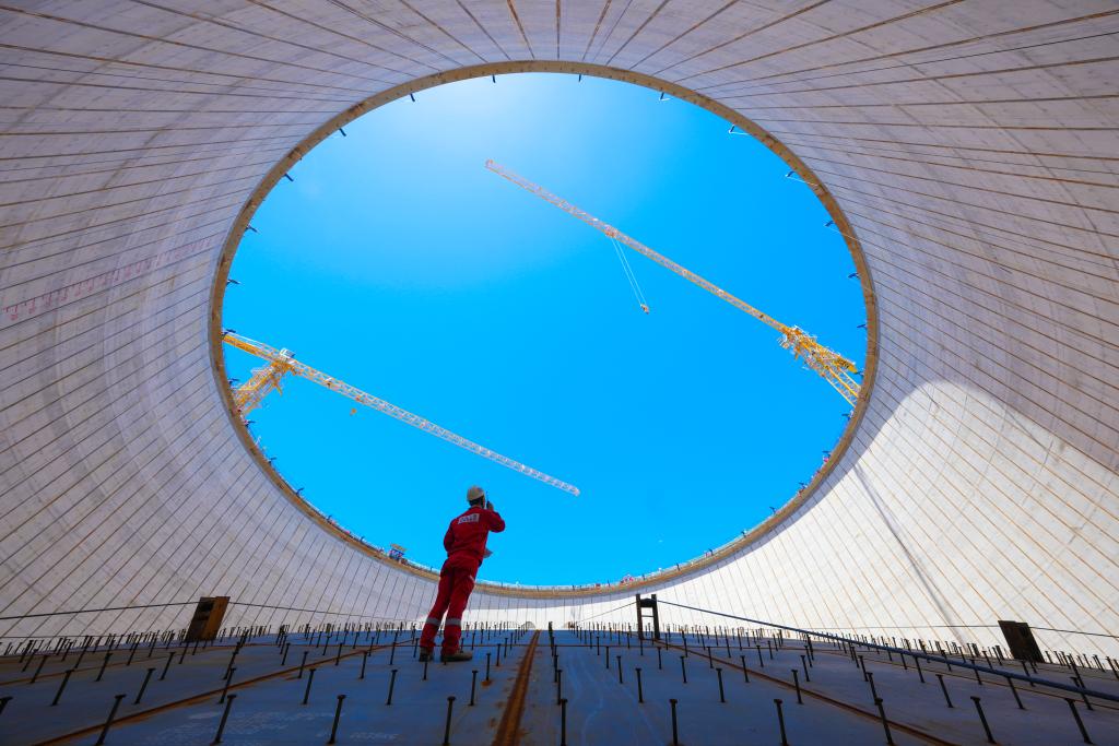 7月29日,储罐升顶前,项目工程师在储罐内进行现场巡检。(李浩玮 摄)