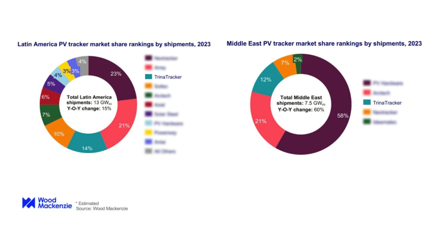 根据标普全球统计数据,2023年全球跟踪支架出货量天合跟踪排名第六,全球市占率6%,较前一年增加100%,业务增长量全球第二,是增长速度最快的企业之一。 伍德麦肯兹报告指出,天合跟踪全球业务增长量第一,在南美、中东等地区排名前三。