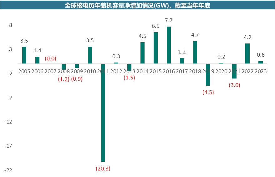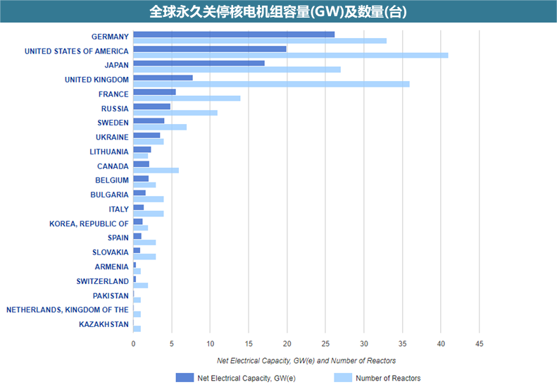 2019年,全球共有13座核反应堆永久关闭,其中日本5座、美国2座、瑞士、德国、韩国、俄罗斯、瑞典和中国台湾各1座,总装机容量9.4吉瓦。其中,除了6座已运行40年以上,大部多数都已按国家政策措施退役。2021年,德国宣布了全面淘汰核电的计划,决定关闭国内最后三座核电站,这标志着德国长达60多年的核时代结束。同时,由于新增装机的低迷,2019年和2021年全球核电装机净增加为负值。