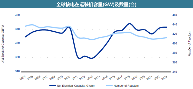受到2011年福岛核电站事故的影响,2011-2014年全球在运核电装机容量处于近二十年的低位,直至2017年才恢复到事故前水平。近年来,新冠疫情和地缘政治冲突带来的供应链问题引发了全球能源市场的动荡,世界各国纷纷重新思考能源安全战略,更加关注能源的多样性及自主可控的能源供应。同时,在双碳的大背景下,核能作为一种清洁、低碳、高效、运行稳定的能源形式,在保障能源安全、推动能源转型、助力碳达峰碳中和及气候目标实现中发挥着重要作用。