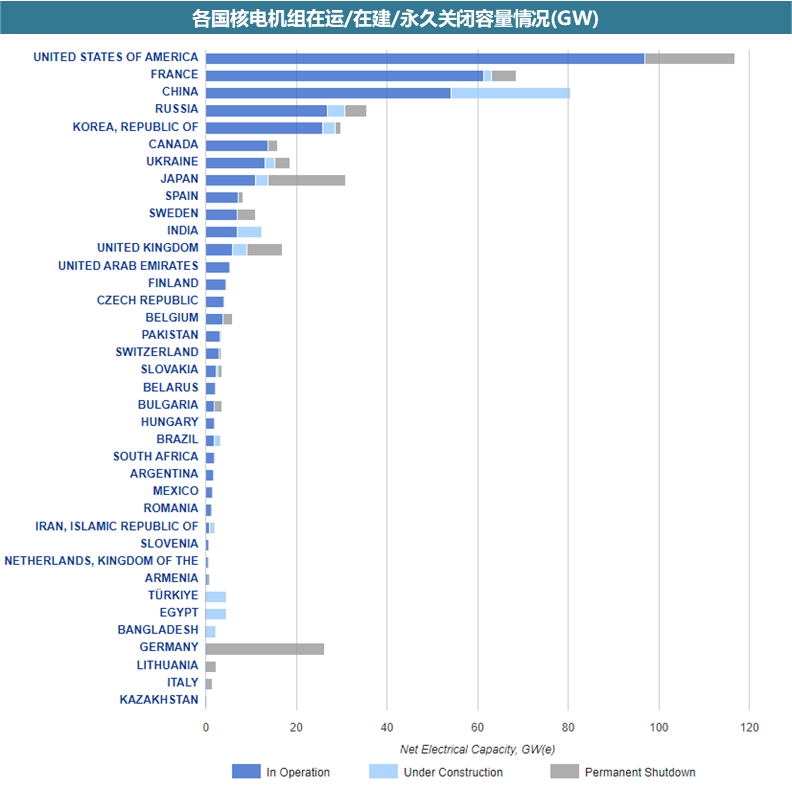 根据IAEA的数据,德国共计永久关停核电机组26.23GW,处于全球第一,当前已无在运核电机组,紧随其后的是美国19.98GW、日本17.12GW和英国7.75GW。美国更多的是老旧机组的退役淘汰;日本则对核电的复苏非常谨慎,虽有一些核电站重启,但总体上核电发电比例下降;英国对核电的态度比较复杂,但目前仍在继续发展核电,同时处理老旧机组的退役问题。