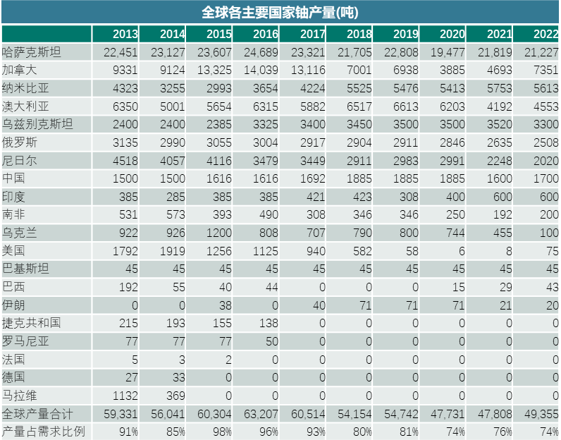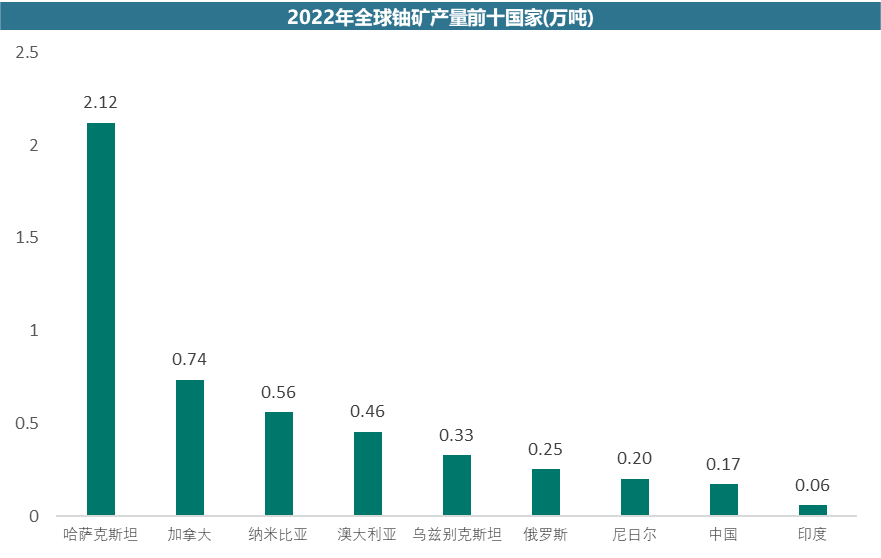 当前,全球铀矿产量最大的国家是哈萨克斯坦,占比约为40%左右,紧随其后的是加拿大13%、澳大利亚12%、纳米比亚11%、乌兹别克斯坦6%。但以上国家都不是最大的核能发电国家,供需关系存在空间错配,一定程度上推高了铀矿价格。