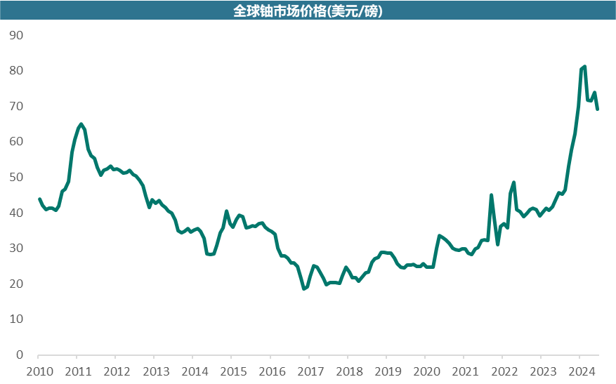 作为结果,铀价2023年一度出现暴涨。在根据国际货币基金组织的数据,2023年年初铀价为40.06美元/磅,年底涨到70.06美元/磅,涨幅达到74.89%。2024年2月铀价达到2010年后的历史高点81.32美元/磅,当前价格回落至69.19美元/磅。
