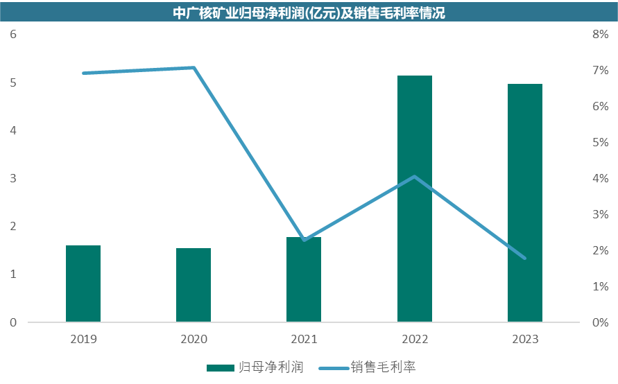 公司以98%现货价格从谢公司、奥公司采购天然铀资源并销售给中广核集团,毛利率约为2%。公司自产贸易价格方面按照60%现货价格+40%基价确定。受铀价上涨影响,公司2022年以来归母净利润保持高位。