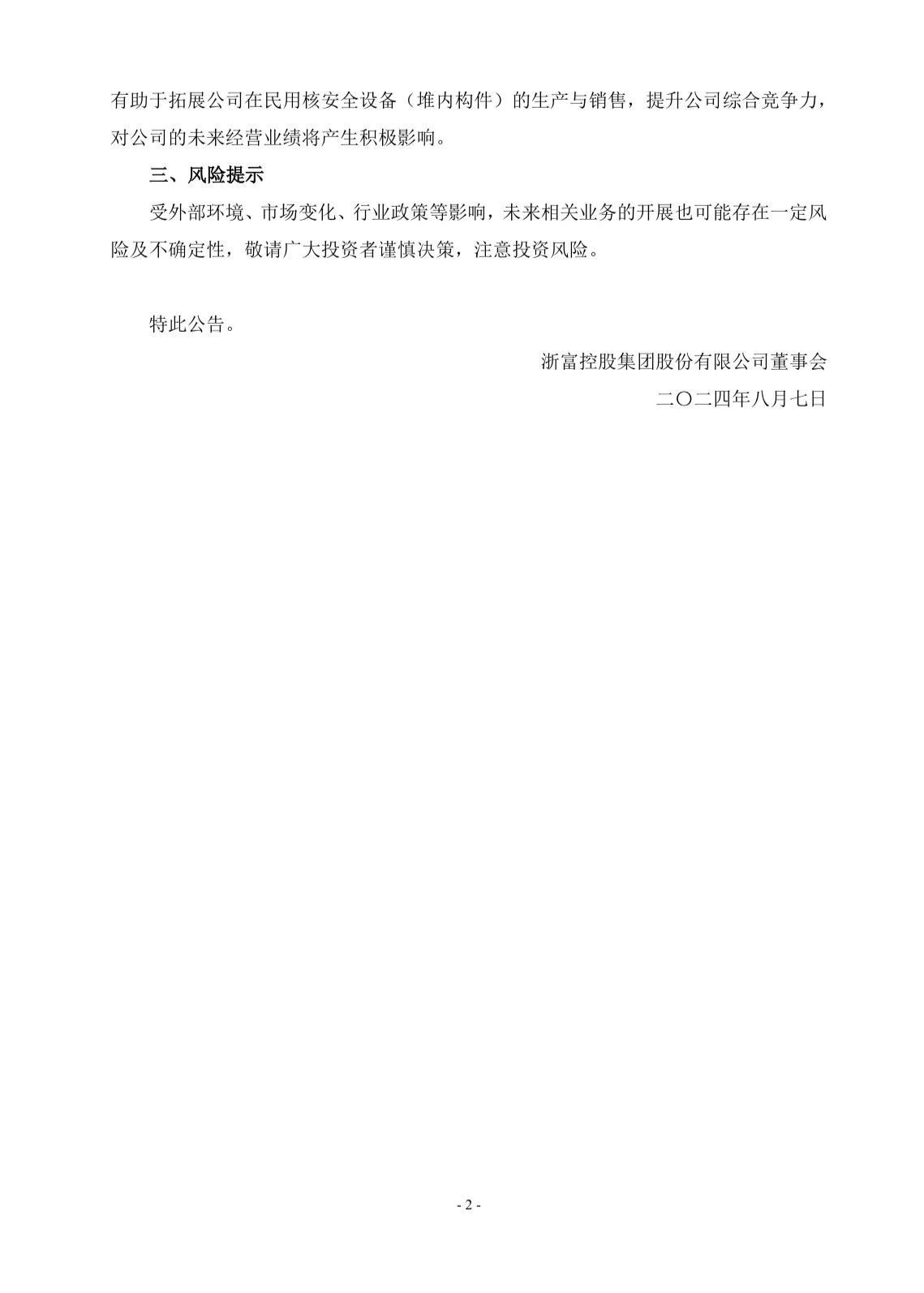 2024-04-30 杭州浙富核电设备有限公司获得国家核安全局颁发的《民用核安全设备制造许可证》。