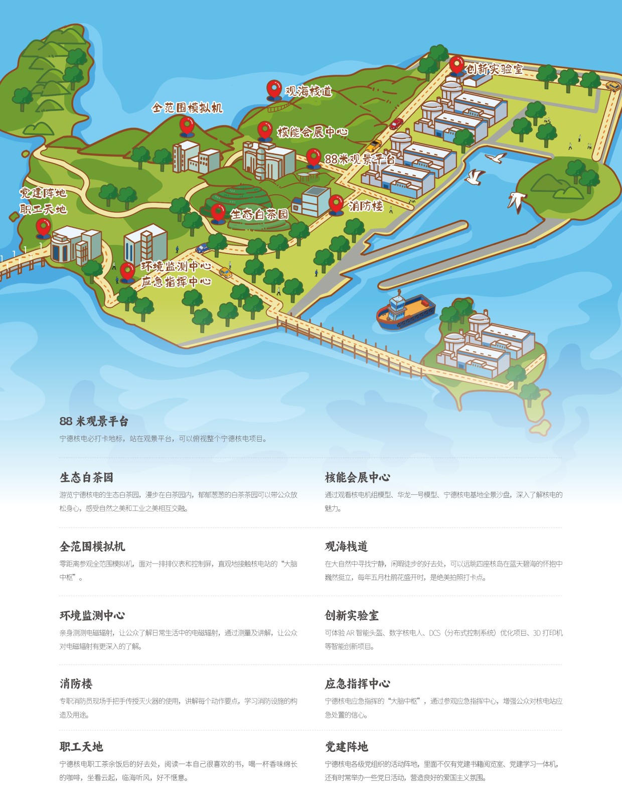 本届87公众开放体验日活动现场,《中广核核电工业旅游白皮书》正式发布,这是全国核电行业首份工业旅游白皮书。白皮书不仅包含了中广核九大核电基地的工业旅游路线图,而且整合了核电基地周边富有特色的旅游景点,通过手绘地图结合文字介绍的形式,为公众提供了一站式核电工业旅游指南,这些兼具趣味性、实用性的地图也同步在核电工业旅游预约系统中展示,为公众提供更便捷的指引。