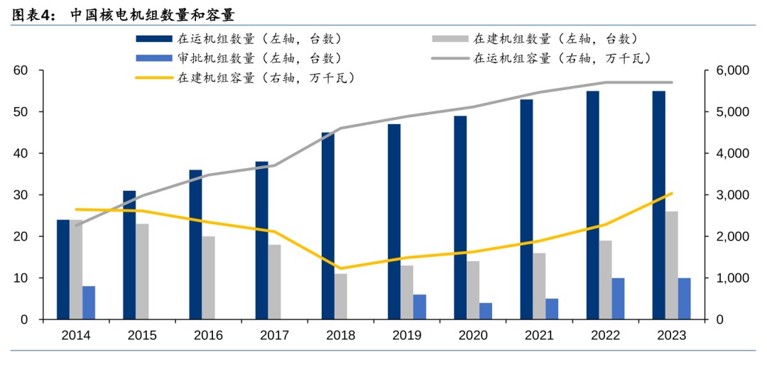 核电发电稳定/碳排放低,安全为发展前提,常态化审批渐进。核电站发电原理是利用铀核裂变所释放出的热能驱动汽轮机做功,具备能量密度高、功率大、发电稳定且成本低的特点,其年平均发电小时数是中国发电设备发电小时数平均值的2倍。安全是核电行业发展的前提,自日本福岛核事故以来,我国核电审批一度停滞,2016-2018连续3年没有新增审批核电机组。直到2019年中国重启核电审批,随后三年每年核准机组数量稳定在4-5台,十四五规划中明确提出安全稳妥推动沿海核电建设。2022年和2023年我国均核准10台,较2021年数量翻倍,审批显著提速,常态化审批渐行渐近。