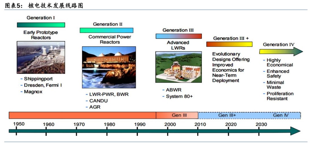 裂变核电技术已发展到第四代,安全/可持续性/经济性不断提高:(1)第一代核电技术:1950s-1960s期间,美苏英法等国建造一代堆,主要是试验性和原型反应堆;(2)第二代核电技术:1960s末期,和第一代反应堆相比,装机容量不断增加,主要堆型有压水堆、沸水堆、重水堆等;(3)第三代核电技术:主要是先进轻水堆,包括先进压水堆和先进沸水堆,其特点是采用非能动安全系统或先进的能动安全系统以提高安全性;(4)第四代核电技术:由第四代核能系统国际论坛(GIF)提出的能够解决核能经济性、安全性、废物处理和防核扩散问题的第四代核电核能系统,包括钠冷快堆、高温气冷堆、气冷快堆、铅冷快堆、超临界水堆和熔盐堆。