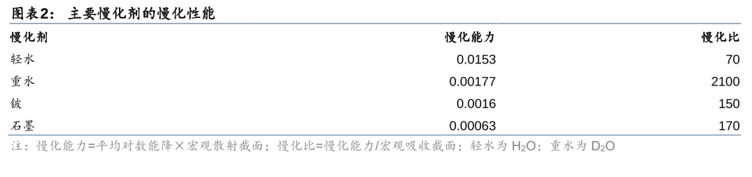 慢化剂的中子吸收截面影响慢化剂的选择,并对燃料中的铀丰度提出不同要求。慢化剂在慢化中子过程中,不仅会与中子发生弹性散射,还会吸收一部分中子,使得反应堆内中子通量下降,反应堆功率下降。对于中子吸收能力强的慢化剂,需要用高富集铀燃料(U-235含量在2%-5%)以保证反应堆内的中子通量;而对中子吸收能力弱的慢化剂,则可以用天然铀燃料(U-235含量为0.7%)。因此慢化剂的选择需要综合考虑慢化能力和对中子的吸收截面,例如,重水的慢化能力仅次于轻水,但由于H-2的中子吸收截面小于H-1的中子吸收截面,使得重水的慢化比远高于轻水,具有很高的中子经济性,可以使用天然铀做核燃料。反应堆中常用的慢化剂包括轻水(H2O)、重水(D2O)、铍、石墨等。