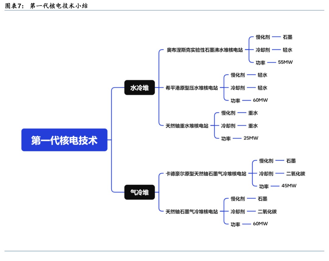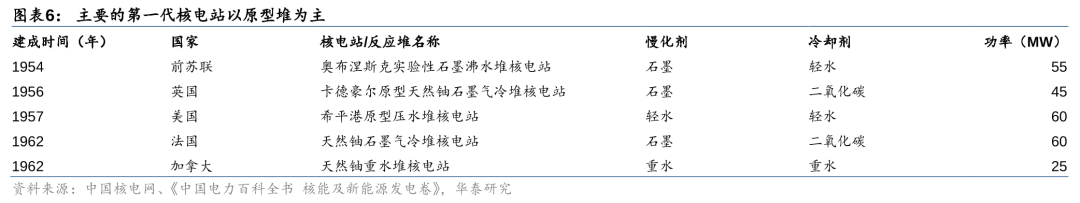 第一代核电以原型堆为主,主要用于验证核电设计技术和商业开发前景。1954年6月27日,前苏联建成的世界上第一座核能发电站5MW奥布涅斯克实验性石墨沸水堆核电站。随后各国纷纷开始研究核电技术,建立了一系列的核电站,包括1956年英国45MW卡德豪尔原型天然铀石墨气冷堆核电站、1957年美国60MW希平港原型压水堆核电站、1962年法国60MW天然铀石墨气冷堆核电站、1962年加拿大25MW天然铀重水堆核电站。第一代核电站的投资费用高、功率普遍较小,建造的主要目的是为了通过试验示范来验证核电的工程实施可行性。