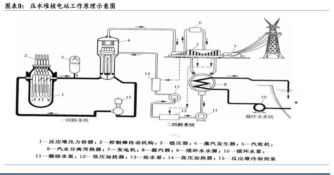 第二代核电在第一代核电的基础上实现了商业化应用,按照冷却剂的不同,可分为轻水堆和重水堆,其中轻水堆按照工作原理不同分为压水堆和沸水堆。在核燃料上,由于冷却剂中子吸收概率的不同,压水堆和沸水堆使用高富集铀,而重水堆使用天然铀。在回路系统上,压水堆和重水堆均采用二回路系统,回路系统相似,包括反应堆容器、冷却剂泵、稳压器、蒸汽发生器、汽轮机、汽水分离再热器、凝汽器、凝结水泵、给水加热器、除氧器、疏水泵、给水泵等,其主要差别体现在反应堆结构上;而沸水堆采用一回路系统,省去了蒸汽发生器和稳压器,增加了汽水分离器、蒸汽干燥器、喷射泵和再循环泵,这使得沸水堆在运行过程中放射性物质泄露的风险更大。