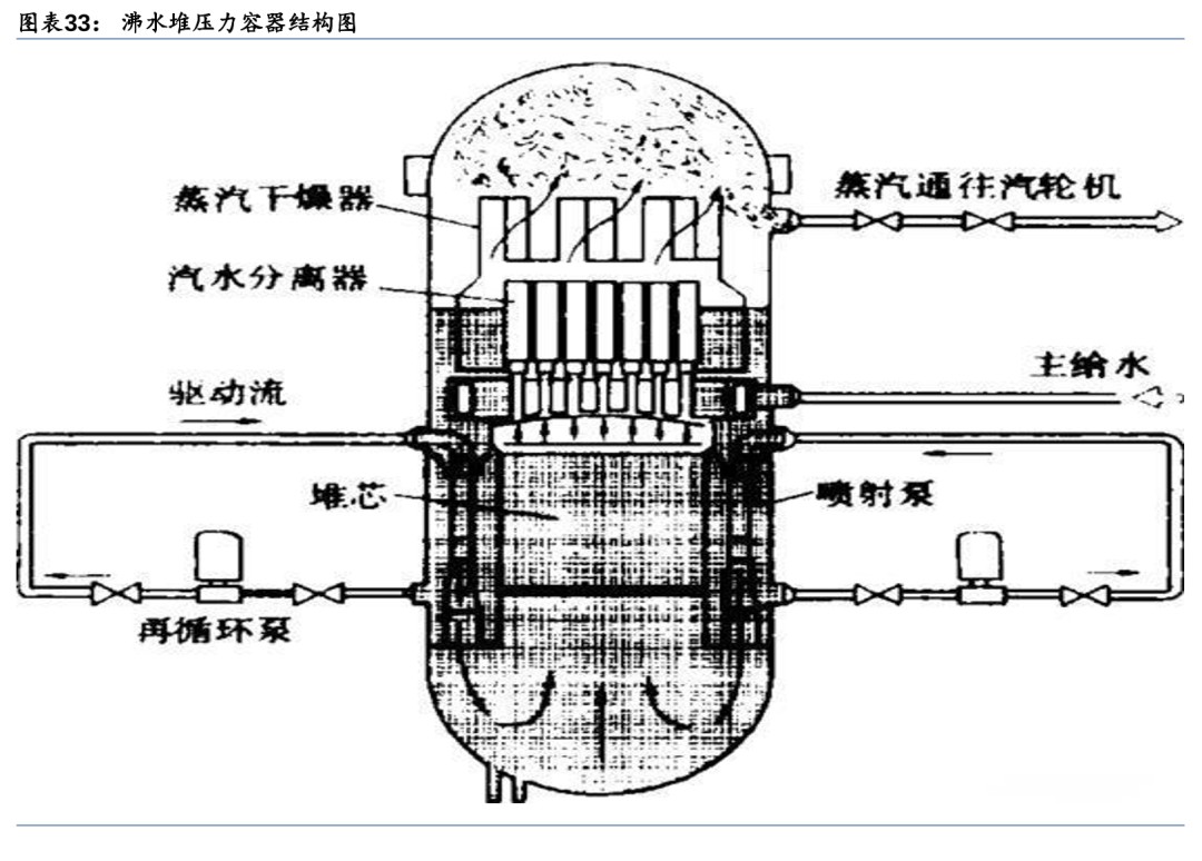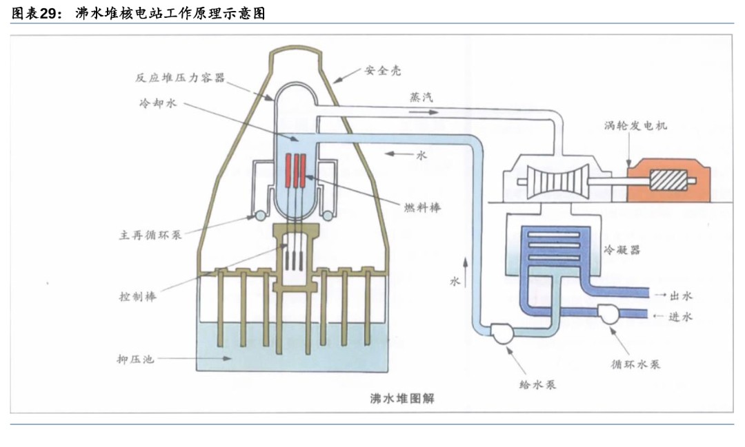 沸水堆系统简化事故减少/能自动调节功率,但存在放射性物质泄露和机构故障风险。沸水堆的优点在于:系统简单,工作压力较于压水堆(150个大气压)减半,省去了压水堆电站中的易出现事故的蒸汽发生器和稳压器,使电站回路事故减少;具有较大负反应性空泡系数,能够自动调节反应堆功率,使反应堆运行更稳定。其缺点在于:水沸腾后密度降低,慢化能力减弱,导致功率密度降低;沸水堆蒸汽由堆内直接产生进入汽轮机,导致O-16经过(n,p)反应后产生的N-16的泄露,N-16有很强的辐射,因此汽轮机组正常运行时会带有很强的放射性;控制棒驱动结构在堆芯底部,一旦发生紧急停堆事故,控制棒不能依靠重力下降,存在因机构故障而不能插入反应堆的风险。