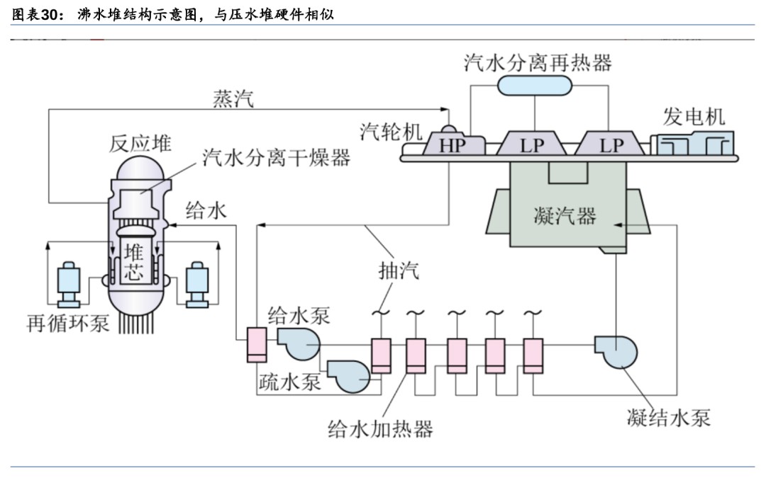 沸水堆硬件结构与压水堆相似。两者回路系统设备主要差别在于由于沸水堆压力容器内有汽水分离器、蒸汽干燥器和喷射泵,因此体积比压水堆压力容器大;由于反应容器上方需要安装汽水分离器和蒸汽干燥器,这使得沸水堆的控制棒需要从堆底引入,控制棒驱动机构安装在反应堆压力容器底部;沸水堆采用再循环系统,以再循环泵替代了反应堆冷却剂泵,冷却剂泵设置在一回路系统中,用于驱动冷却剂完成循环,而再循环泵设置在压力容器两侧,用于调节堆芯内部冷却剂流量,调节反应堆功率。