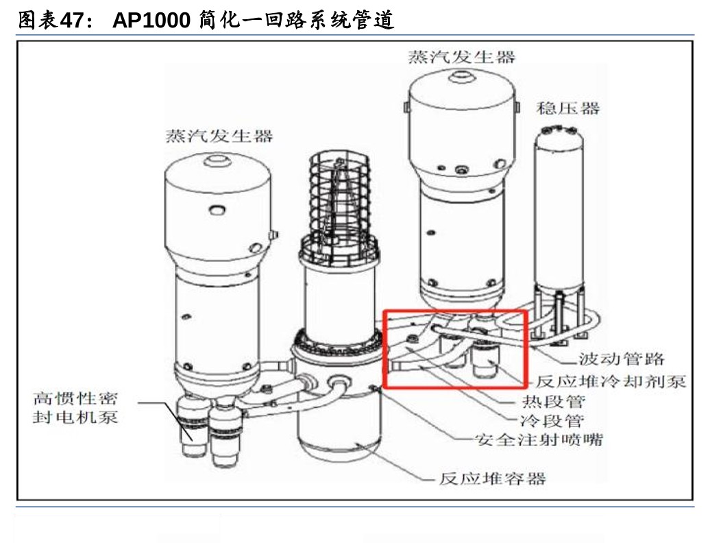 AP1000反应堆一回路基本保留二代压水堆设计,简化一回路管道提高安全性和可维修性。二代压水堆的一回路系统由反应堆容器、稳压器、蒸汽发生器、冷却剂循环泵以及连接管道组成,AP1000的一回路系统与二代压水堆类似,不同之处在于AP1000的冷却剂循环泵直接与蒸汽发生器相连,取消了泵与蒸汽发生器之间的管道,降低管道破裂风险。AP1000通过简化蒸汽发生器、泵和管道的基座和支承系统,可减少在役检修量和提高可维修性。