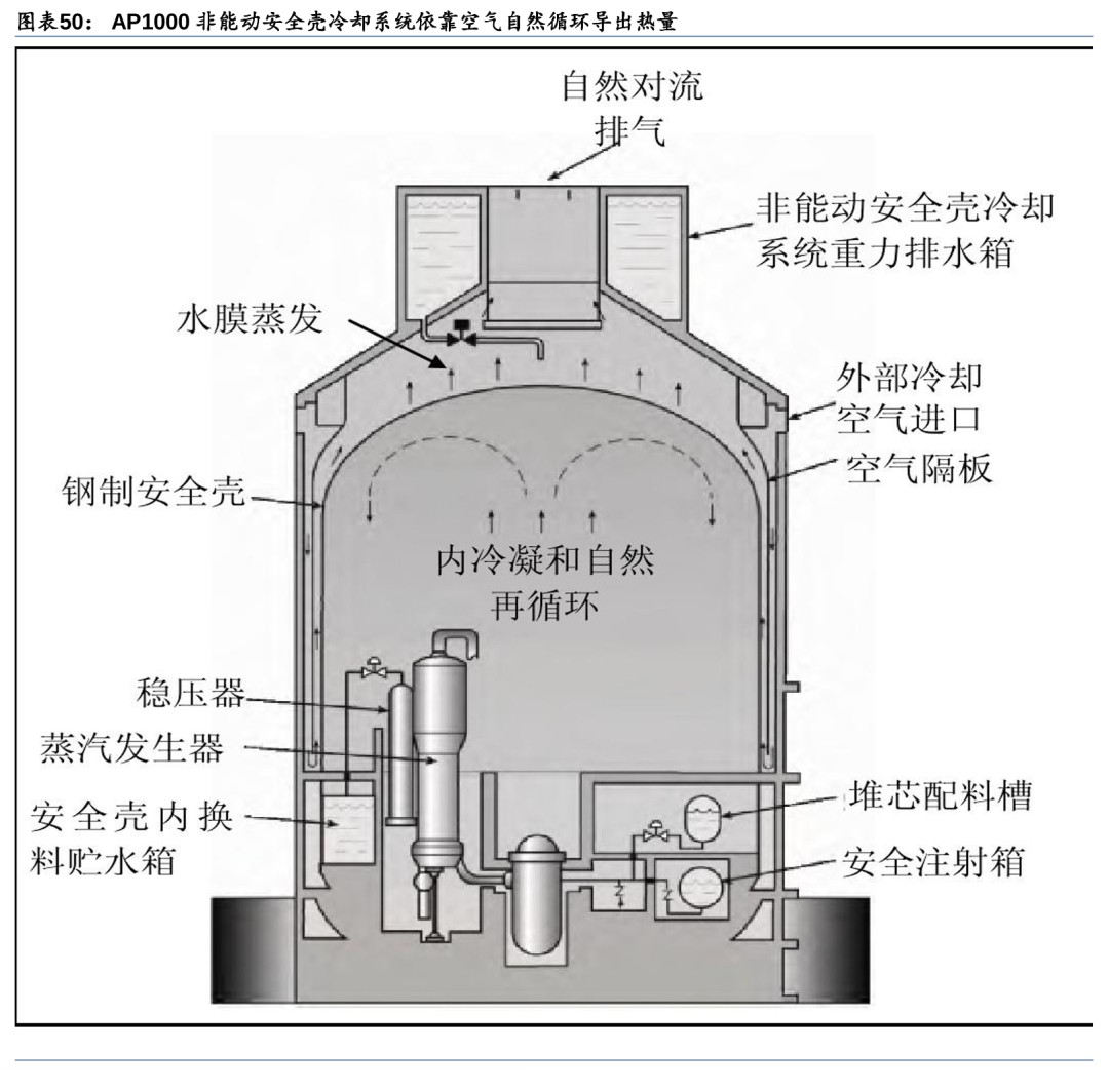 华龙一号(HPR1000):能动与非能动安全系统相结合,中国自主产权已实现出口验收华龙一号采用能动与非能动相结合的安全系统。中国自主三代核电华龙一号已实现出口并通过验收。华龙一号以能动和非能动的方式实现应急堆芯冷却、堆芯余热导出、熔融物堆内滞留和安全壳热量排出等功能。在核岛布置设计中考虑了安全系统和正常运行系统间充分的物理隔离,专设安全系统主要布置在两个安全厂房内,正常运行系统主要布置在反应堆厂房、电气厂房、燃料厂房及核辅助厂房内;同时冗余的两个安全系列分别布置在两个安全厂房中并且由独立的应急柴油发电机供电。两个安全厂房位于反应堆厂房两侧,两个应急柴油发电机厂房也分别布置在核岛的两个角落,实现了实体隔离。专设安全系统主要包括安全注入系统、辅助给水系统与安全壳喷淋系统。