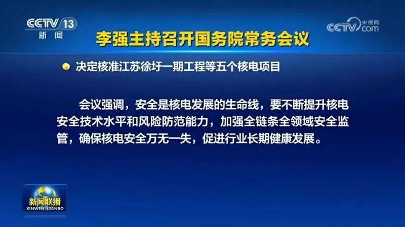 8月19日,经国务院常务会议审议,决定核准江苏徐圩一期工程等五个核电项目。会议强调,安全是核电发展的生命线,要不断提升核电安全技术水平和风险防范能力,加强全链条全领域安全监管,确保核电安全万无一失,促进行业长期健康发展。