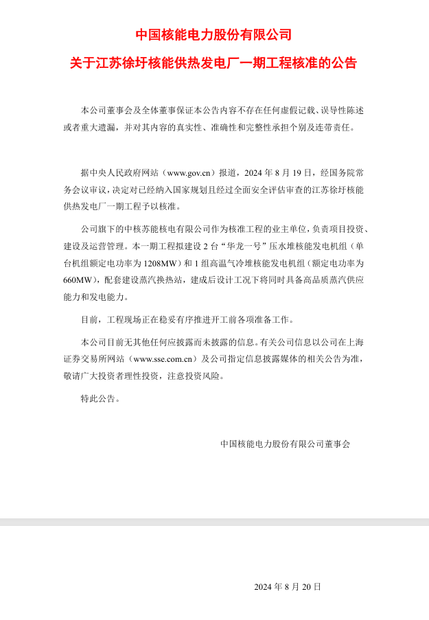消息发布后,中国核电(全称为中国核能电力股份有限公司)发布了关于江苏徐圩核能供热发电厂一期工程核准的公告。公告显示,8月19日,经国务院常务会议审议,决定对已经纳入国家规划且经过全面安全评估审查的江苏徐圩核能供热发电厂一期工程(以下简称核准工程)予以核准。