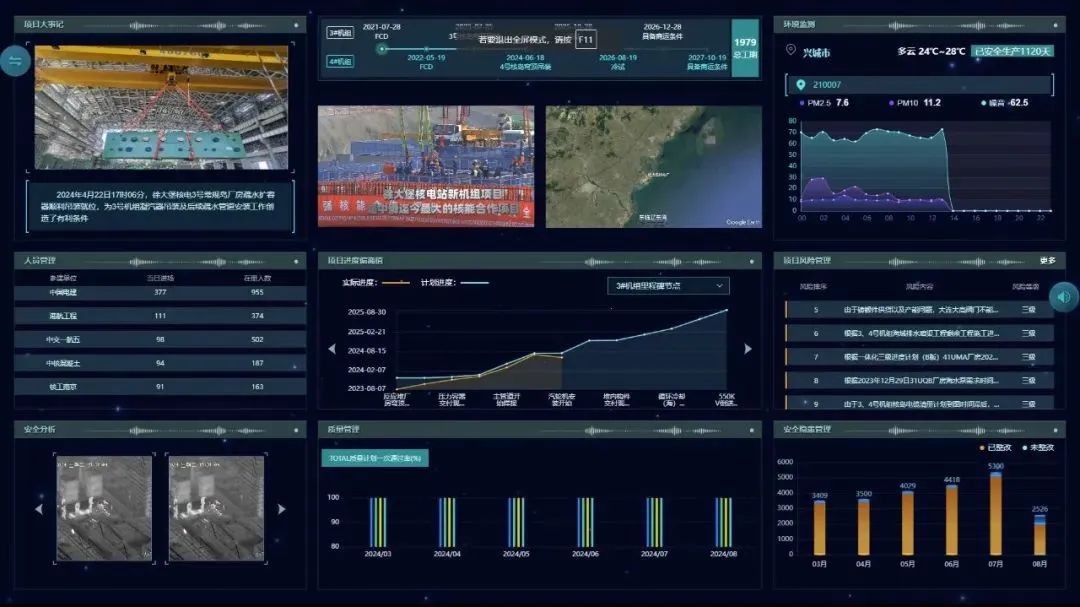 徐大堡核电作为集团公司智慧工地统建试点项目,在多方大力协同下共同建设智慧工地。智慧工地管理平台依托现场搭建的无线网络以及随处可见的摄像头和无人机,对重点区域、重点环节进行全面监控。徐大堡核电智慧工地的指挥大厅,每一位来访者都能从智慧大屏看到不同高度、不同角度的现场航拍画面;每一位项目管理人员都能通过指挥中心大屏和手机移动端,实时、全面地掌控现场施工情况。