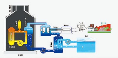 在荣成的国家电投新能源科技馆,一个1∶60的模型清晰展示了国和一号的构造。核电机组整体上可分为两大部分:一侧是核岛,有高耸直立的核反应堆压力容器和蒸汽发生器,钢穹顶上方放着一个巨大水箱;另一侧为常规岛,核岛产生的蒸汽传送过来驱动汽轮机发电。
