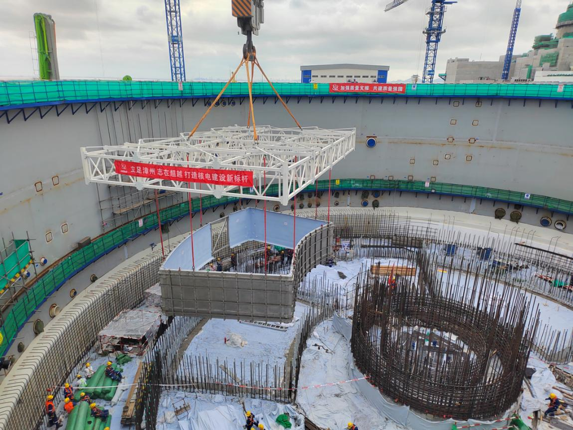2024-04-30 9月7日,华龙一号漳州核电3号机组核岛反应堆厂房内置换料水箱不锈钢模块组吊装成功,首次实现当日内连续完成三次大件吊装工作,这是继3号机组钢衬里模块吊装后完成的首批不锈钢模块,为3号机组反应堆厂房内部结构主线施工顺利进行提供了有力保障。