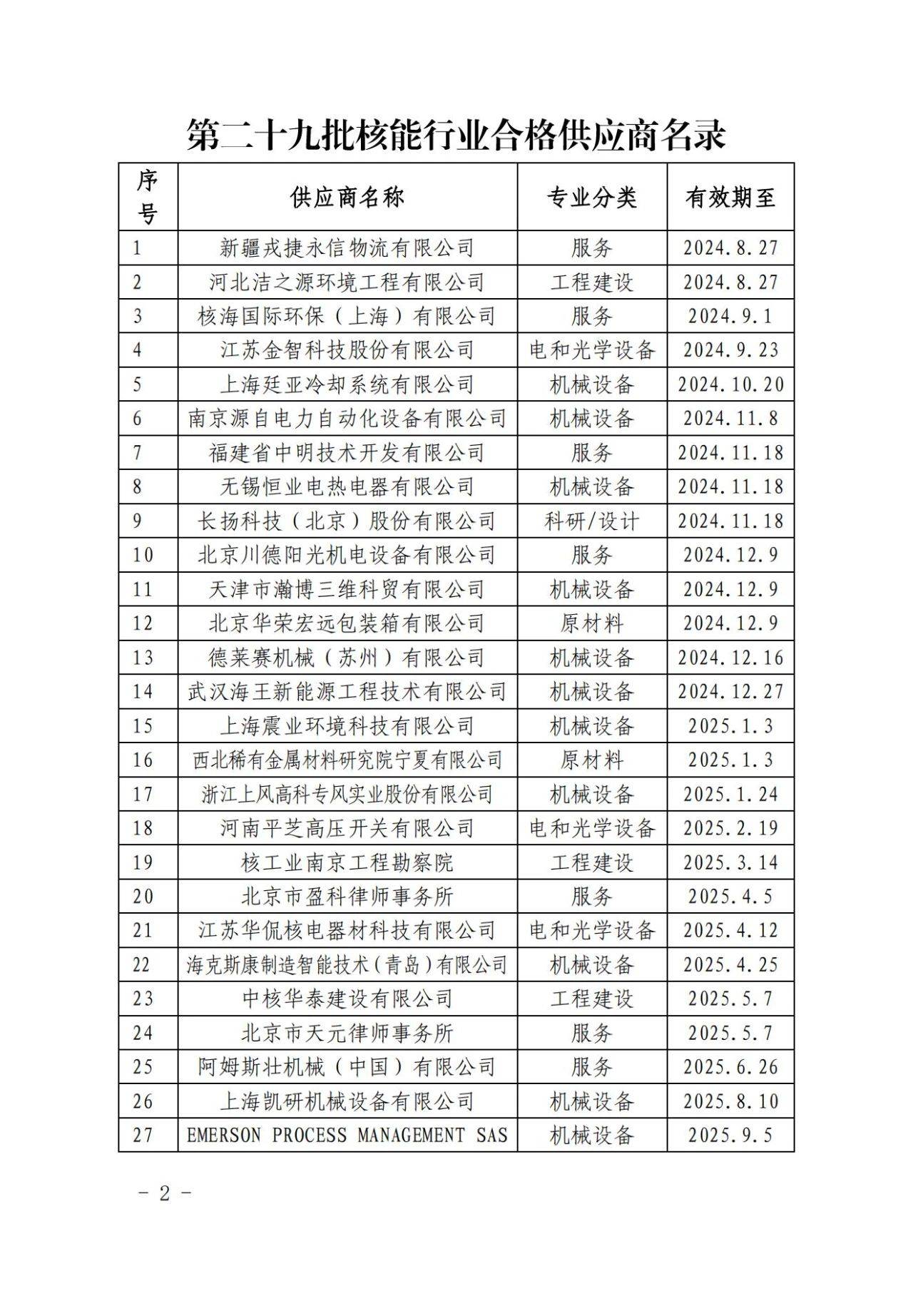 2024-04-30 据新能源圈了解到,5月15日,中国核能行业协会发布第二十九批核能行业合格供应商名录的公告,共73个核能行业合格供应商,详情如下: