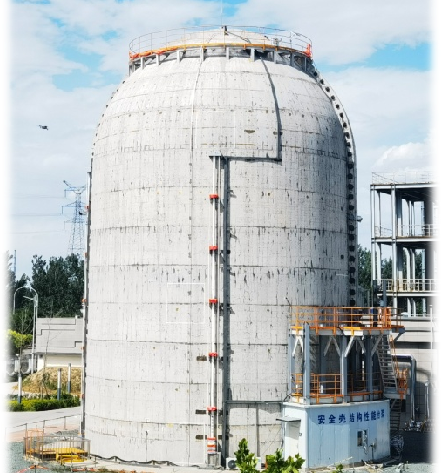 安全壳结构性能实验平台(玄武)包括安全壳结构模型、热压耦合加载系统和智能化监测系统,可用于开展安全壳打压试验研究、模拟严重事故热压耦合工况下结构性能和包容能力研究、安全壳监测技术智能化平台技术研究、安全壳老化管理等研究。