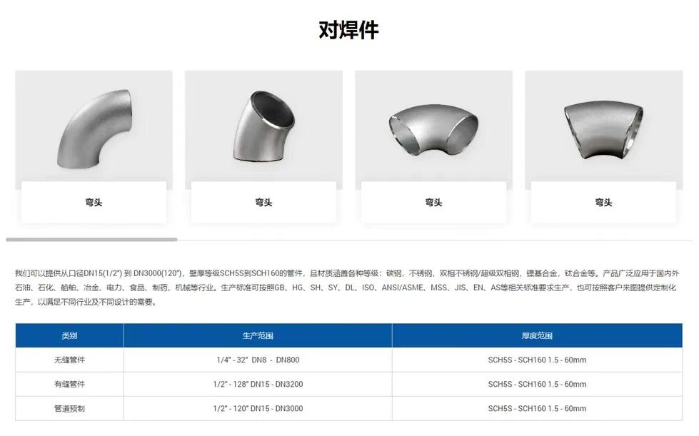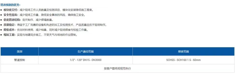 我们可以提供从口径DN15(1/2) 到 DN3000(120),壁厚等级SCH5S到SCH160的管道预制,且材质涵盖各种等级:碳钢,不锈钢,双相不锈钢/超级双相钢,镍基合金,钛合金等。产品广泛应用于国内外石油、石化、船舶、冶金、电力、核能、食品、制药、机械等行业。生产标准可按照GB、HG、SH、SY、DL、ISO、ANSI/ASME、MSS、JIS、EN、AS等相关标准要求生产,也可按照客户来图提供定制化生产,以满足不同行业及不同设计的需要。