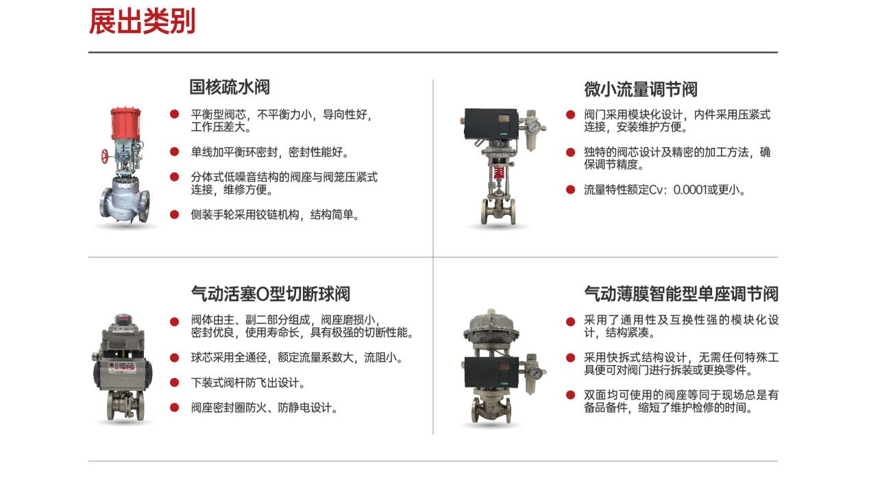 公司主要产品有智能型调节阀、球阀、蝶阀、自力式阀门、专用阀、真空阀等系列,已经被广泛地应用于全球的石油炼化、精细化工、核化工、煤化工、LNG、化纤、电力、冶金、新能源、长输管线、生物医药等领域。永盛科技与国核合作开发了CAP1400机组常规岛高压加热器疏水调节阀,实现了进口替代。从核能开发、利用到废料处理,永盛在核工业领域,拥有全流程、全环节、全生命周期的流体运输控制解决方案,并拥有自主可控的核心技术。本次展会将展出液态金属波纹管密封调节阀、工业蒸汽抽汽调节蝶阀、工业蒸汽除盐水补水调节阀等主要创新产品。