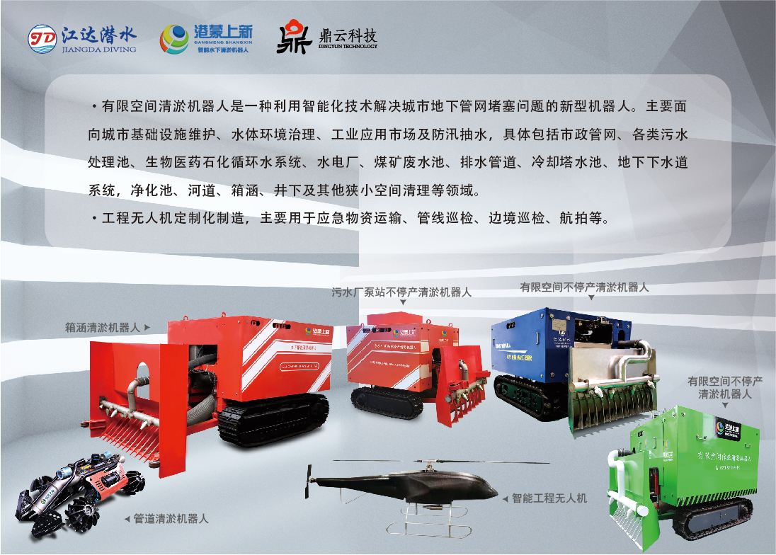 【产品描述】:有限空间清淤机器人是一种高度自动化的智能设备,专业设计用于在水下环境中进行清淤作业。这种机器人适用于多种场景,包括市政管网、各类污水处理池、生物医药石化循环水系统、水电厂、煤矿废水池、排水管道、冷却塔水池、地下下水道系统,净化池、河道、箱涵、井下及其他狭小空间清理等领域。
