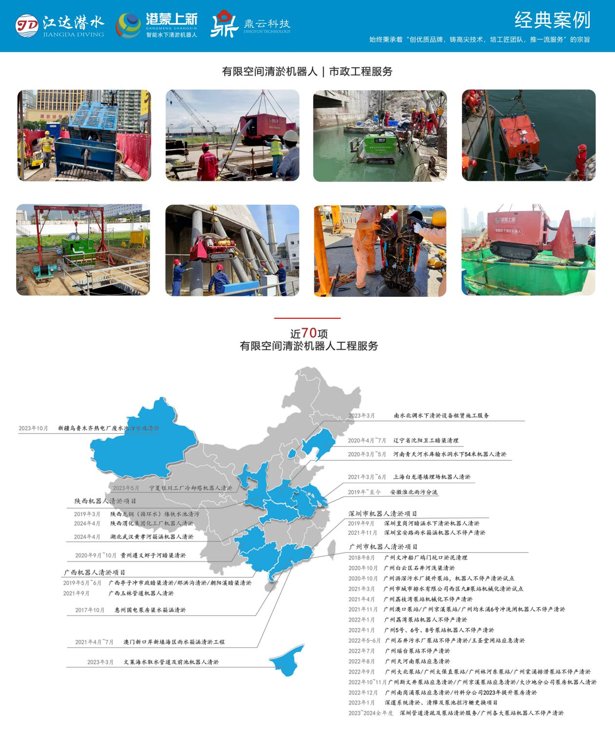 广州市江达潜水疏浚工程有限公司成立于2006年,是一家专业从事水下工程服务和研发制造水下机器人的综合性高新技术企业。2019年被中国潜水打捞行业协会授予潜水服务能力与信用评估二级证书;有限空间清淤机器人已经在70多个项目上完成施工,在2 0 2 0年获得中汽检测产品认证的产品合格证书和符合欧盟法律法规相关安全标准及允许进入欧盟及欧洲贸易自由区国家市场的CE认证证书。2021年入库国家科技型中小企业,被评为2023年上半年创新型中小企业,2023年获得专精特新认证。