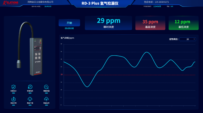 RD-3 Plus氢气检漏仪通过USB通讯接口实现了氢气检漏仪与上位机软件PC端的实时互联,用户可在电脑端实时接收查看氢气浓度值和浓度曲线,也可以对检测数据进行记录、保存和下载操作,便于用户进行数据分析。