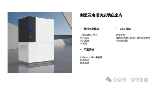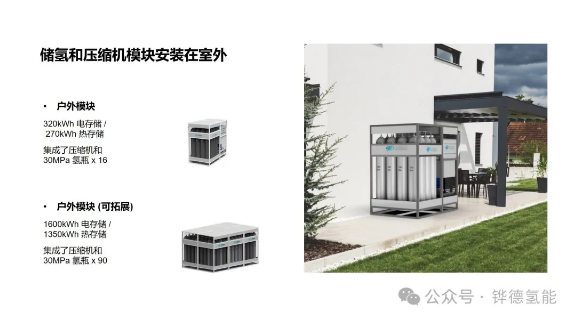 HyESS-R主要面向的是户用氢储能市场,系统是室内室外双系统的设计,室内机主要功能为制氢和发电,室外机主要功能为储氢。室内机由四个模块组成,分别是燃料电池(10KW)、制氢(0.5 标方/小时)、电池组(23kWh)和能量管理模块。室外部分由氢气压缩机和氢气瓶集装格组成,一个集装格包含16个氢气瓶。可存储约320kWh的电力和270kWh的热能。最多可拓展至五组。