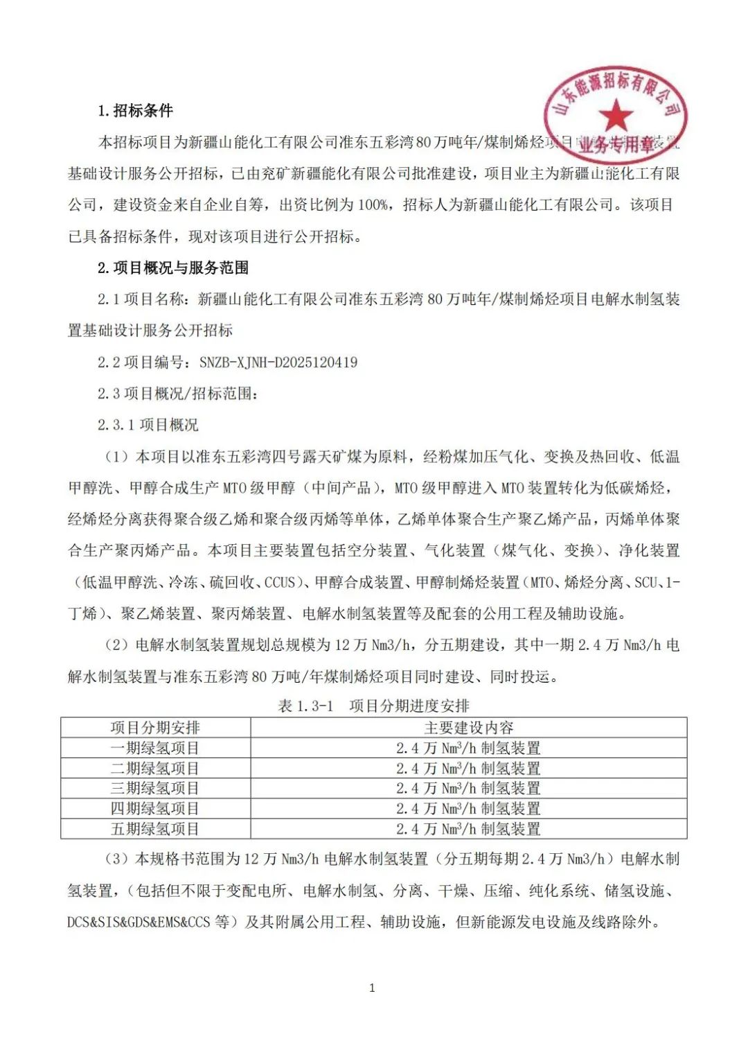 【新疆山能化工有限公司准东五彩湾80万吨年煤制烯烃项目电解水制氢装置基础设计服务公开招标】招标公告