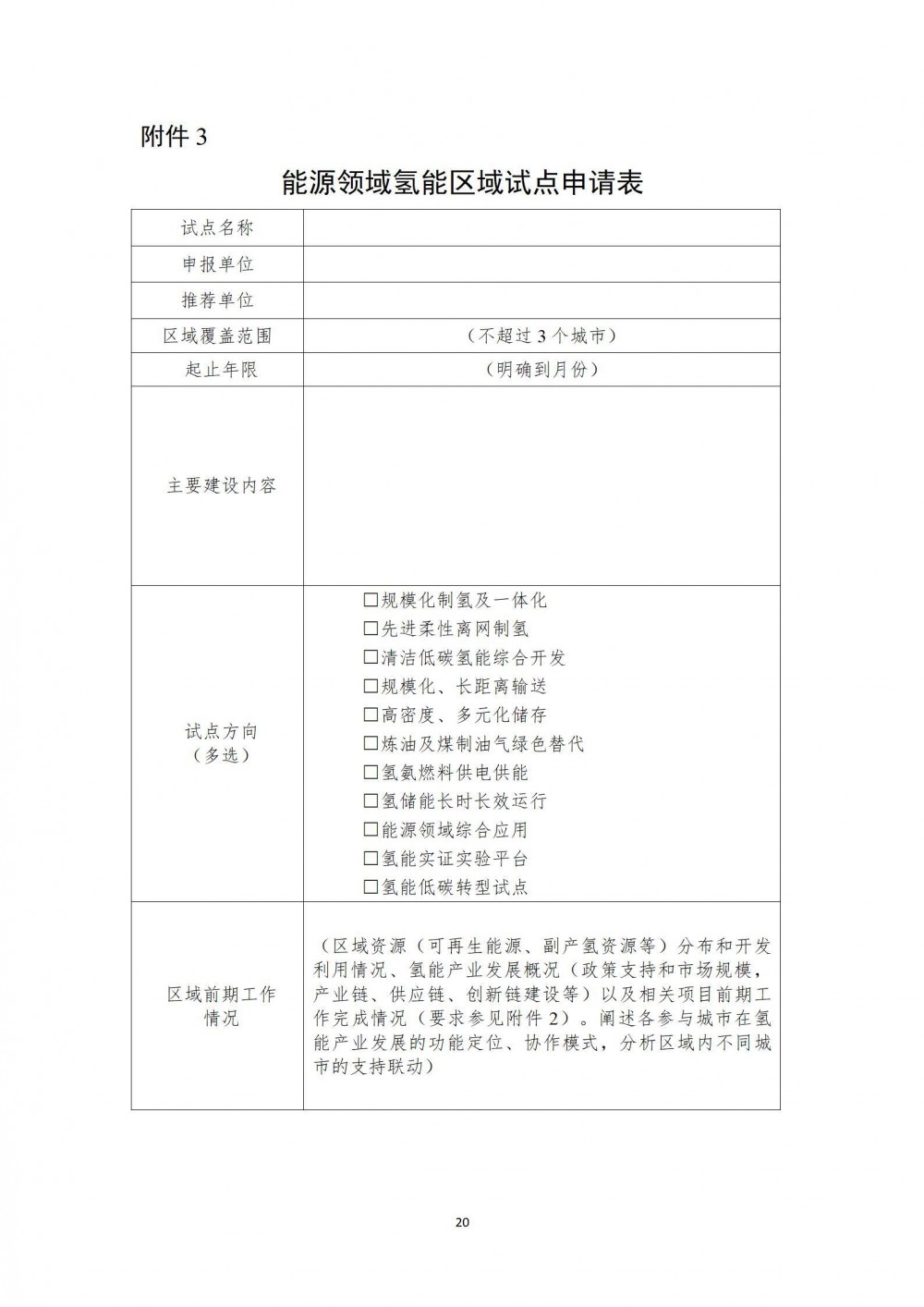 我委收到《国家能源局综合司关于组织开展能源领域氢能试点工作的通知》(国能综通科技〔2025〕91号,见附件),现启动能源领域氢能项目试点和区域试点申报工作。请各单位按照国家能源局通知相关要求,围绕氢能“制储输用”全链条,组织项目业主单位开展项目试点申报(项目以单一试点方向为主,已履行相关审批、核准或备案手续,并具备开工建设相关要素保障条件),结合区域发展实际单独或联合相关区开展区域试点申报(覆盖区不超过3个),项目和区域试点原则上在3年内建成投产或完成试点任务。