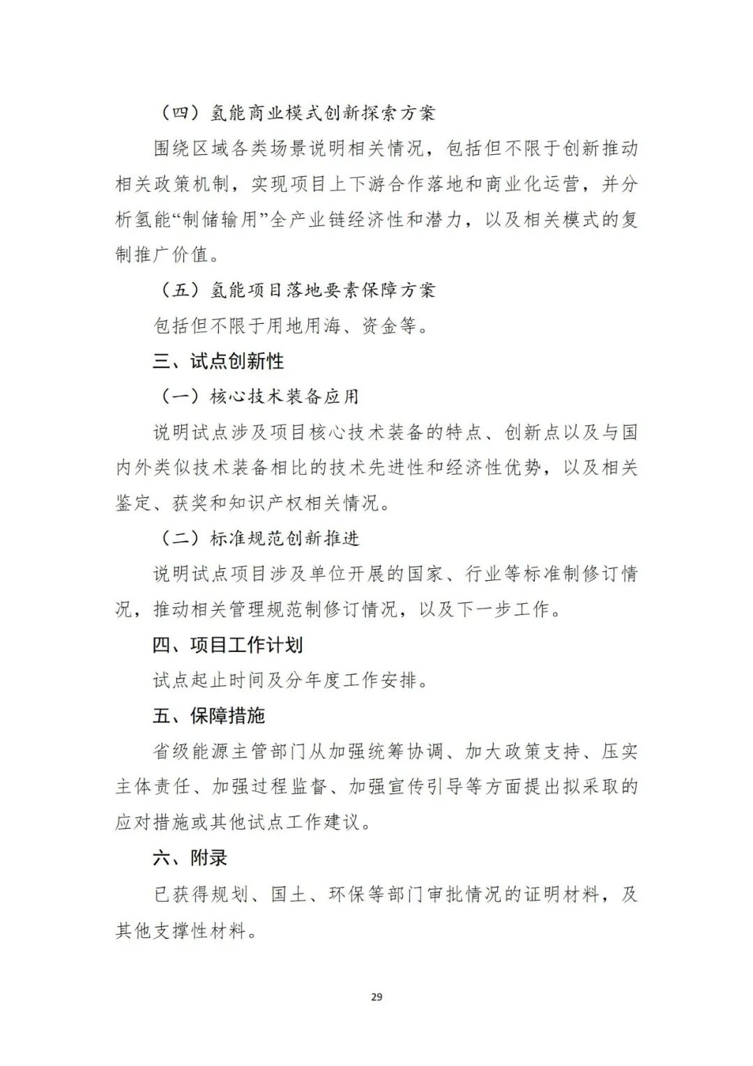 项目试点:依托项目试点推动氢能先进技术与关键装备推广应用,支撑开展各类标准可行性和有效性验证,探索技术先进、模式清晰、可复制推广的项目开发方案。项目试点由业主单位进行申报,以单一试点方向为主。相关项目原则上应已完成核准、备案等工作, 确保试点项目顺利投运,商业模式清晰、成本效益明显、减碳效果突出,支持项目应用国家科技重大专项、国家重点研发计划、首台(套)重大技术装备、能源领域研发创新平台等攻关成果,支撑打 造技术装备成果推广应用新场景、新模式、新机制,巩固提升氢能产业创新力、竞争力。