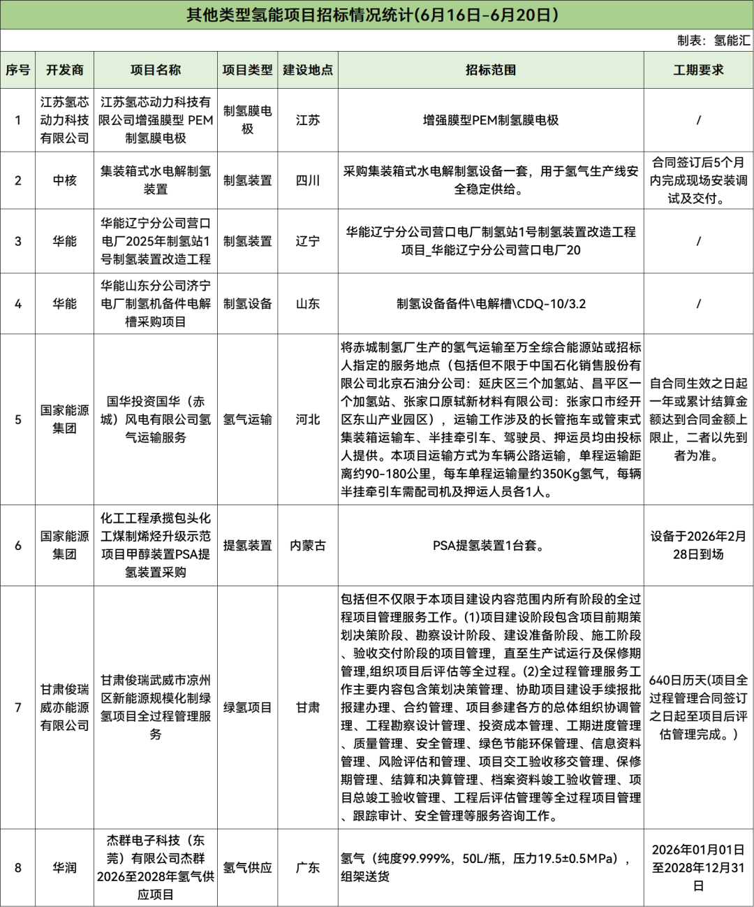据氢能汇统计,本周其他类型氢能项目招标市场方面,共8个项目启动采购,开发商分别是江苏氢芯动力科技有限公司、中核、华能、国家能源集团、甘肃俊瑞威亦能源有限公司、华润。