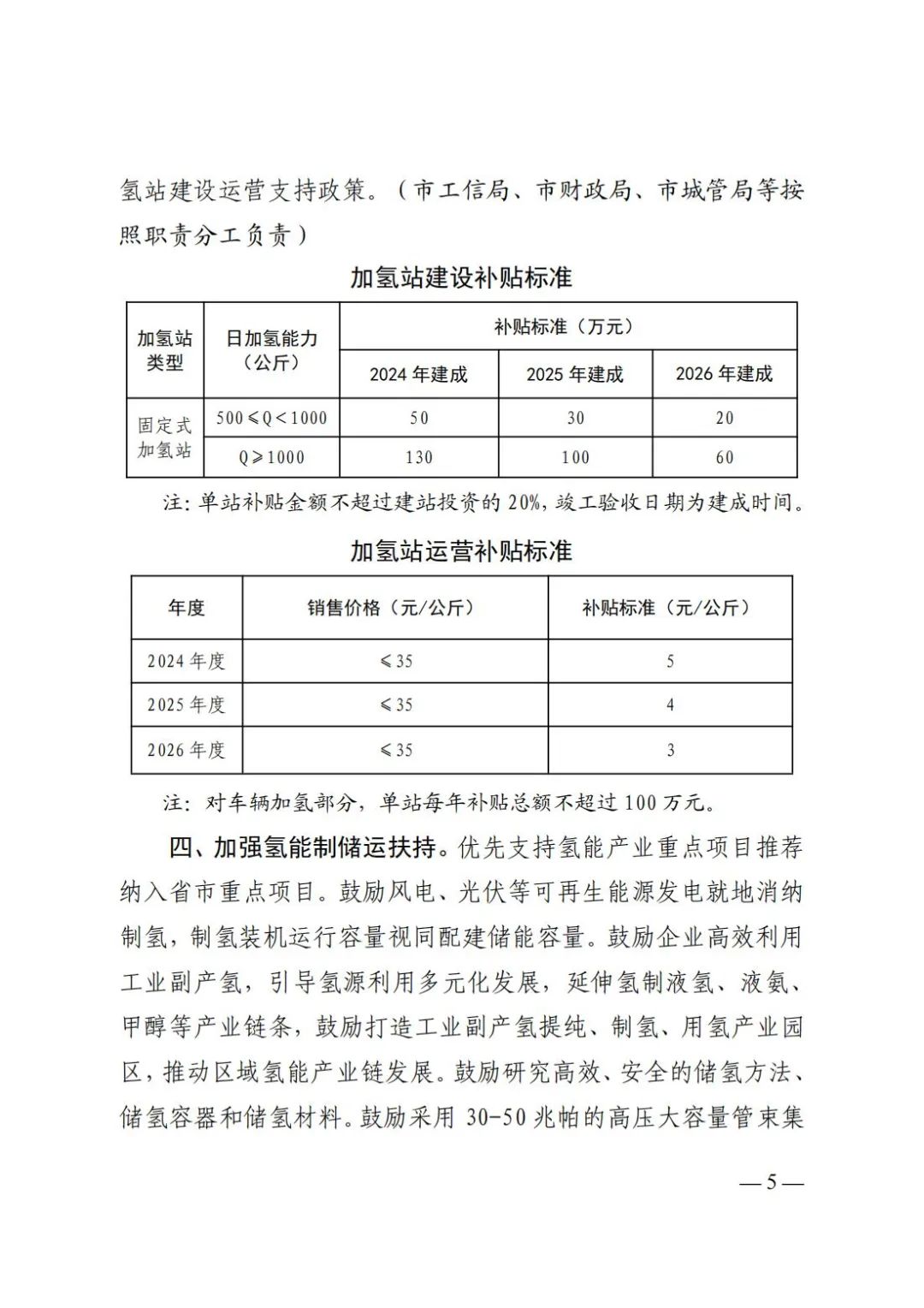 4、加强氢能制储运扶持。优先支持氢能产业重点项目推荐纳入省市重点项目。鼓励风电、光伏等可再生能源发电就地消纳制氢,制氢装机运行容量视同配建储能容量。
