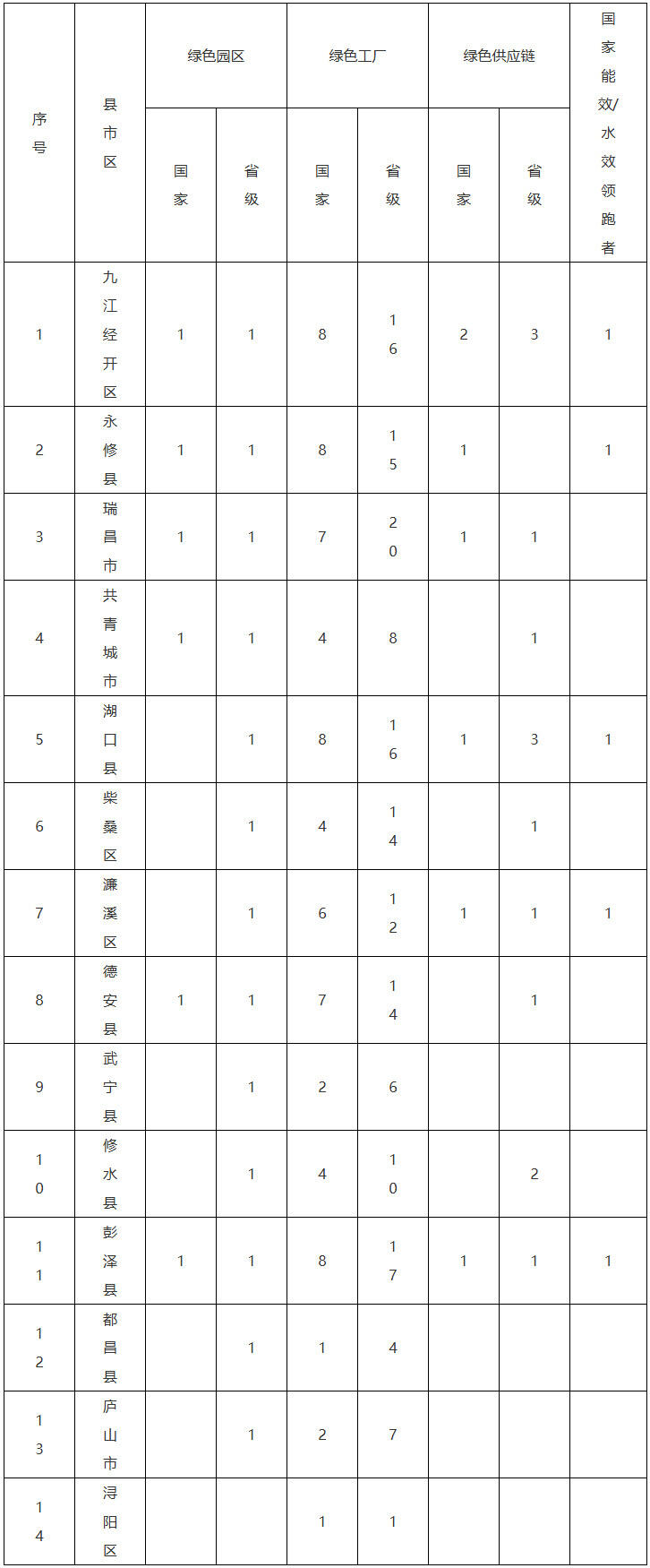 7.打造绿色低碳园区示范标杆。鼓励开发区、工业园区构建系统化、循环化产业链条,促进园区内企业采用能源资源综合利用生产模式,推进集中供气供热、水资源循环使用、废气废液废渣资源化利用,提升园区资源综合利用效能。推动九江经开区绿色低碳升级项目按期实施,达到预期目标。加快培育一批具有示范带动效应的国家级绿色低碳工业园区示范标杆。到2027年,力争新增国家级绿色园区4家,总量达到6家;新增省级绿色园区3家,实现省级绿色园区全覆盖;推动共青高新区、修水工业园、彭泽工业园探索创建零碳园区。(责任单位:市工信局、市发改委)