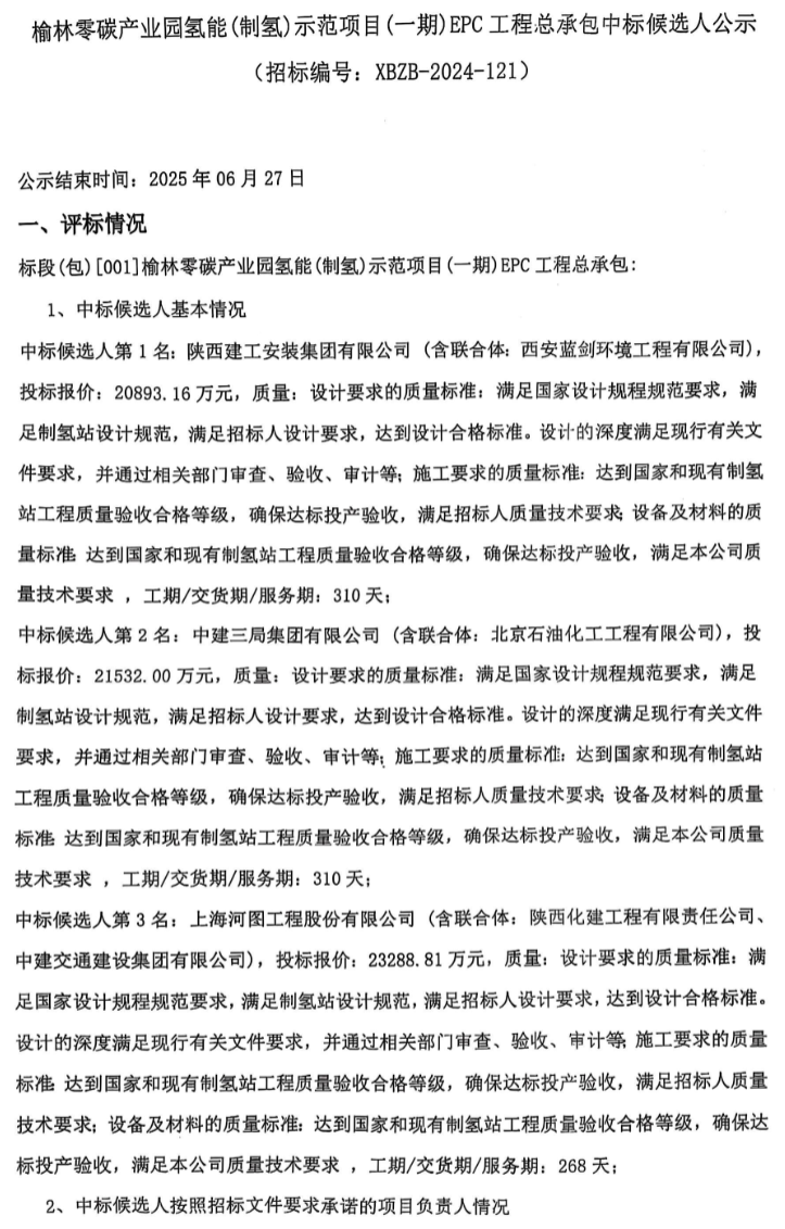 氢能汇获悉,近日,榆林零碳产业园氢能(制氢)示范项目(一期)EPC工程总承包中标候选人公示。