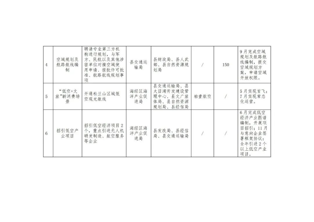 12.支持企业做大做强。坚持“内培外引、引育并举”的工作思路,围绕整机、零部件、材料、动力四大关键领域,引导本地企业向无人机关联产业拓展,重点支持云朵、云泊、派丽肯、瑞鑫、安吉华等低空经济骨干企业做大做强。全力开展低空经济招商引资,招引一批垂直起降飞行器、氢能飞行器等整机、核心部件、高性能材料、动力设备等制造项目,切实打造低空经济企业梯度成长培育体系。(海经区海洋产业促进局、县经信局牵头,县发改局、县投资促进中心等单位配合)