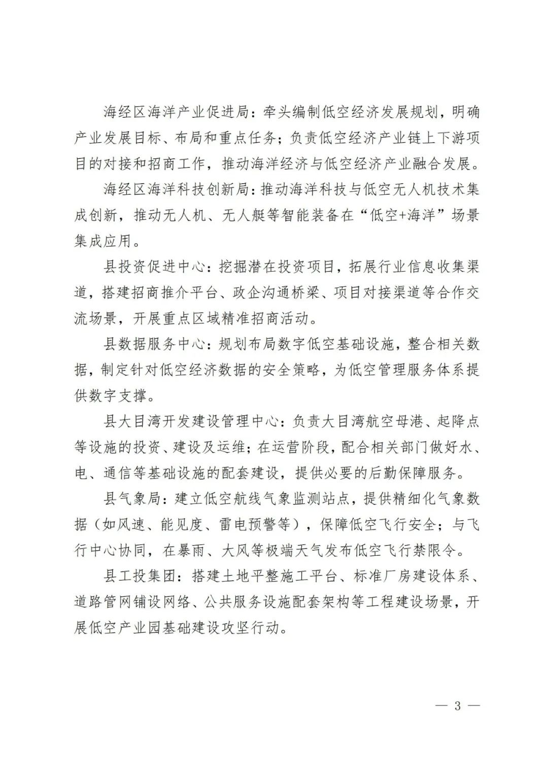 4.强化低空安全管理。构建低空安全管理机制,明确各方管理责任,研究制定应急处置管理办法,加强对相关人员的教育培训,提升风险防控和安全保障能力。(县公安局牵头,县交通运输局、海经区海洋产业促进局、县应急管理局等单位配合)